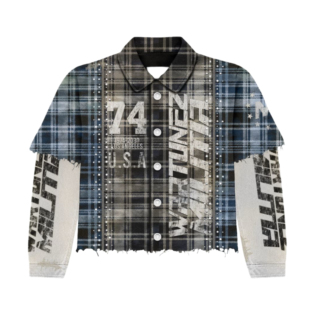 The layered sleeve design adds a unique street-inspired twist, giving the illusion of a hoodie-and-flannel combo while keeping it lightweight and versatile. Finished with button-up closure, standout typography graphics like “74,” “USA,” and “Neptune Matter,” and stud-style accents, this flannel is made for those who aren’t afraid to push boundaries.