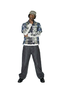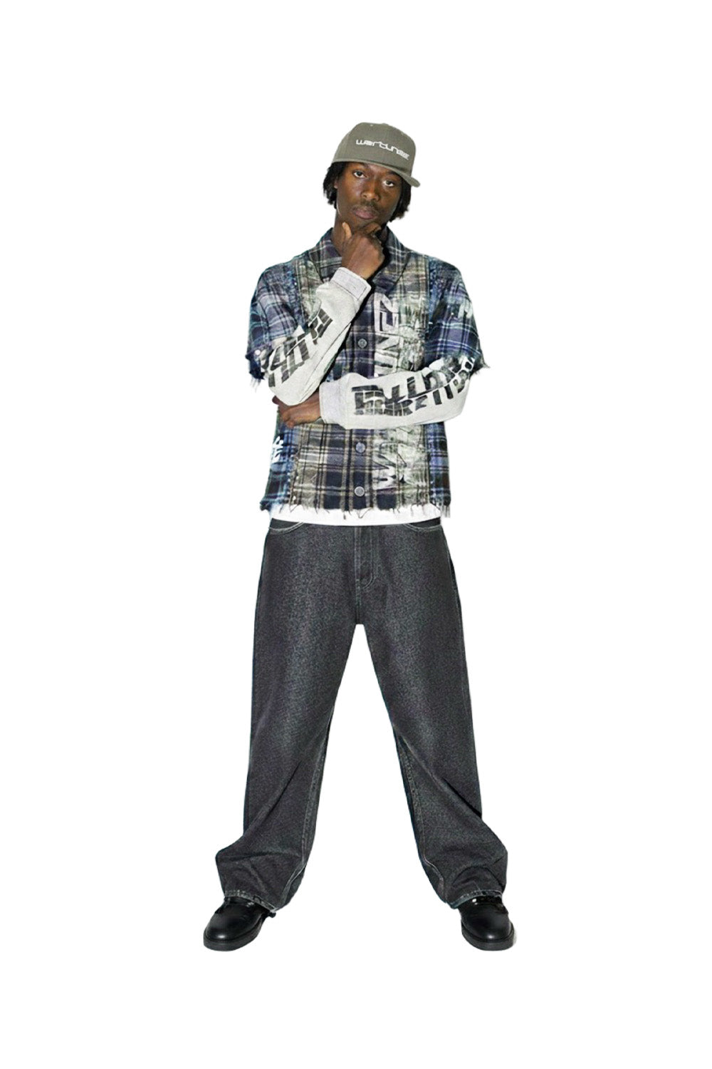Step up your streetwear game with the Blue Layered Flannel, a bold fusion of grunge and modern edge. Designed with a rugged plaid pattern in shades of blue, black, and grey, this statement piece features raw cut-off details, distressed edges, and bold graphic prints across the front and sleeves.
