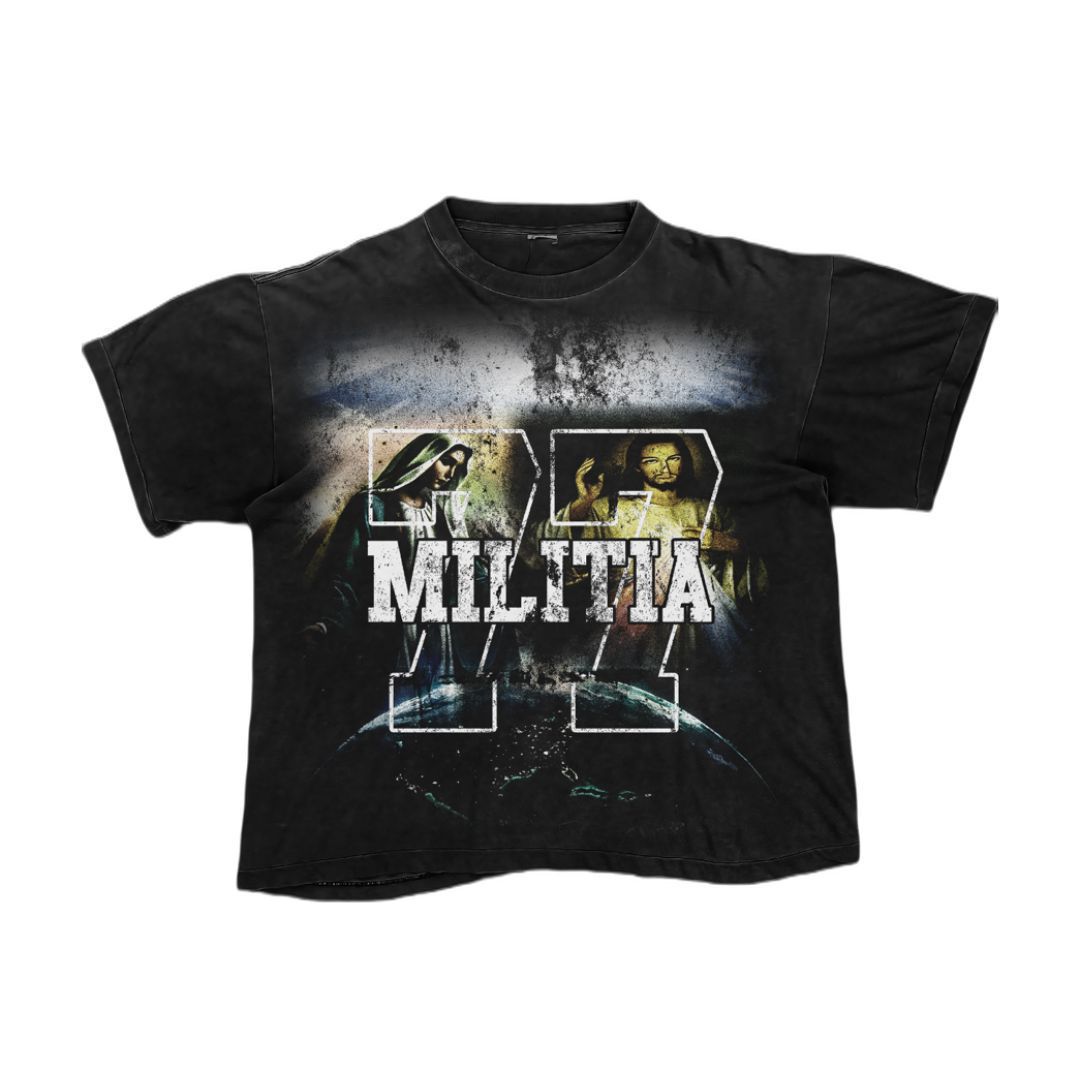 Step into timeless streetwear with this bold Vintage Holy Tee, Crafted from soft, durable cotton, this oversized graphic tee features powerful religious imagery and a bold "Militia" statement print, set against a washed black backdrop for that authentic vintage look.